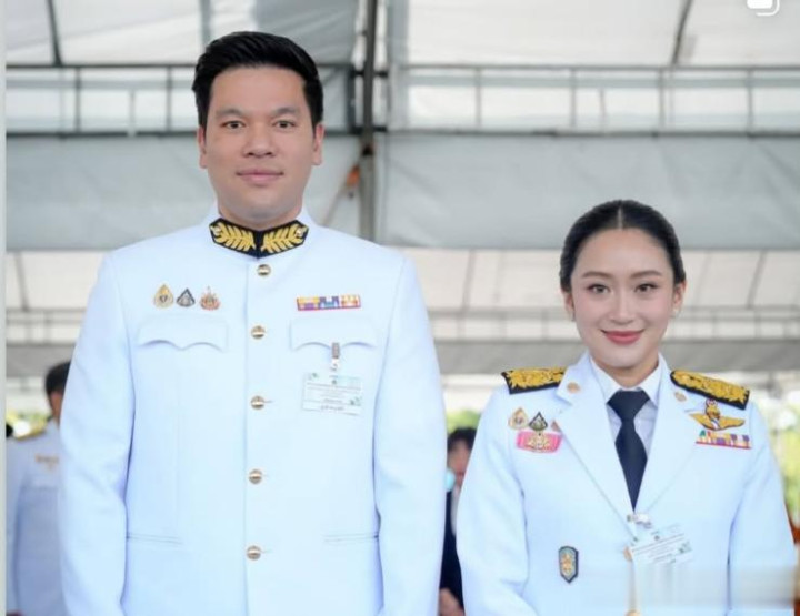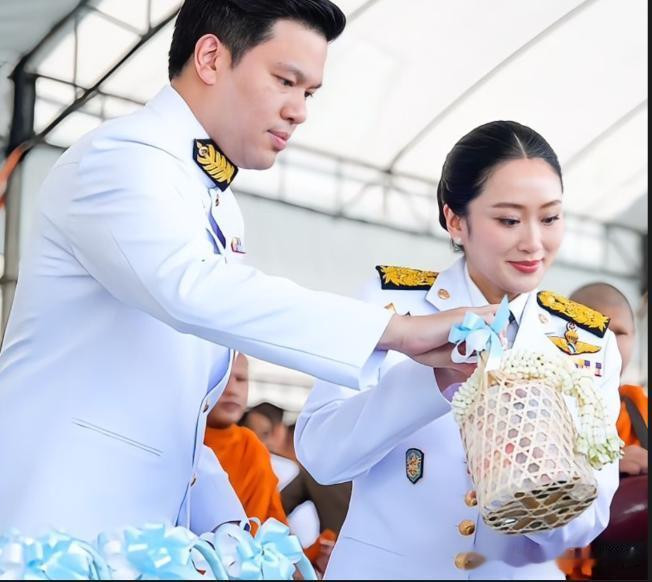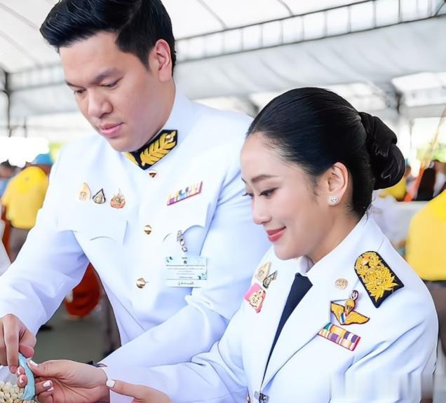 佩通坦身穿白色的泰国公务员制服,身后老公皮塔卡陪着,夫妇俩一起布施功德,诚心为王太后生日祝福。佩通坦的丈夫皮塔卡也是王室旁系后代,论血缘还得叫现任国王玛哈一声伯父,佩通坦也算是玛哈的侄媳妇了。