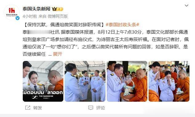 根据泰国媒体报道,泰国文化部部长佩通坦到皇家田广场参加诵经布施仪式,为诗丽吉王太后寿辰祈福。在面对记者时,佩通坦仅说了一句“想你们了”,之后便以微笑代替所有问题的回答,如是否辞职、是否继续留任等。